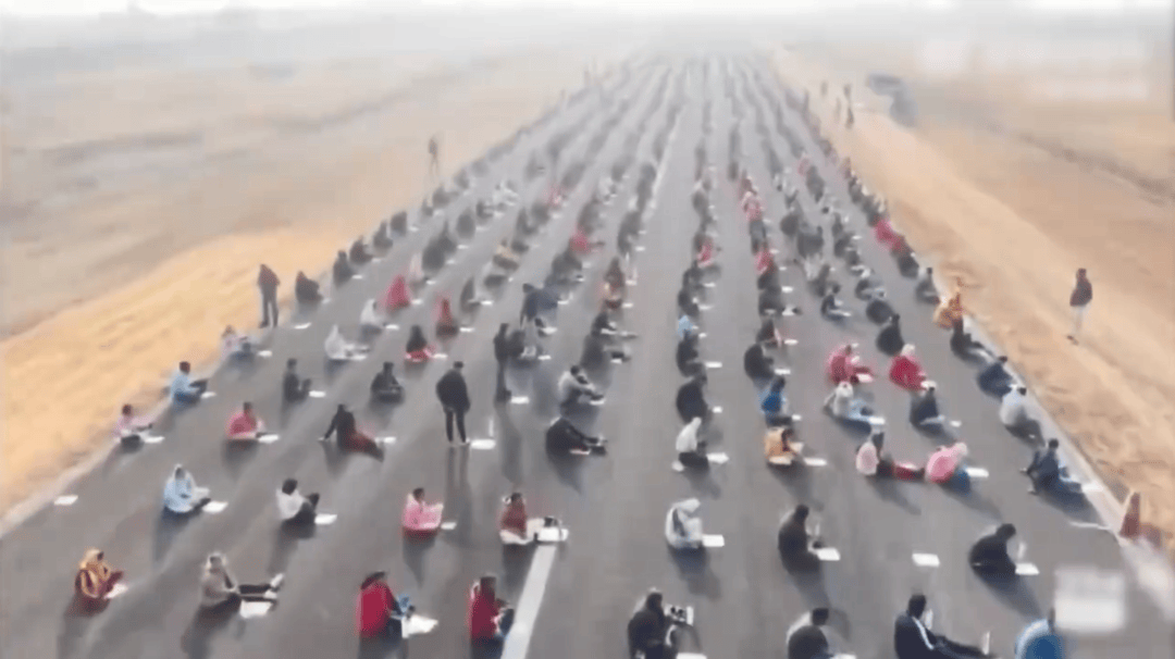 值得注意的是,由于场地有限,此次考试被安排在一处简易机场。无人机拍摄的画面显示,一排排应聘者直接坐在停机坪上,没有桌椅,席地而坐参加政府考试。