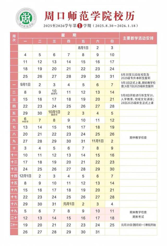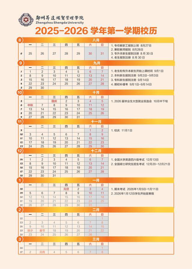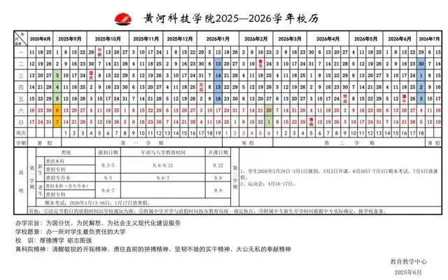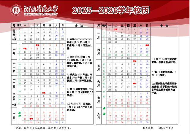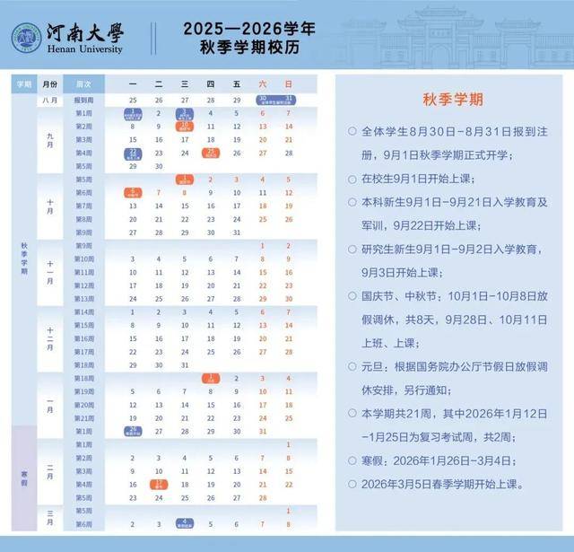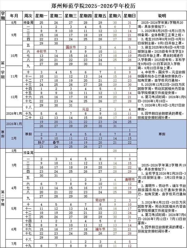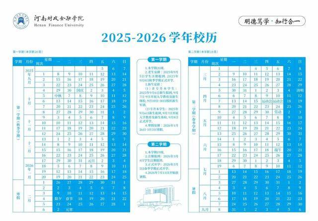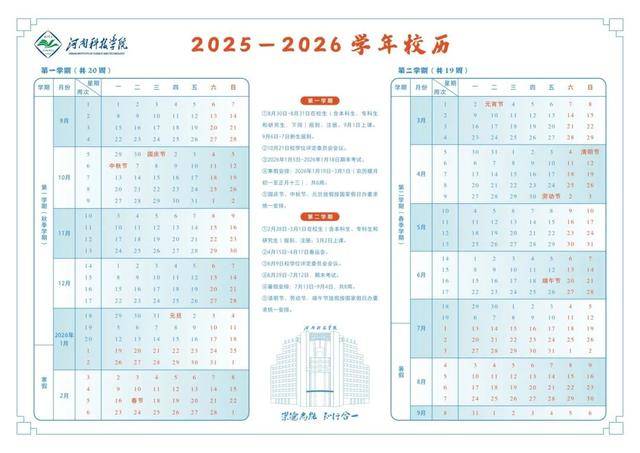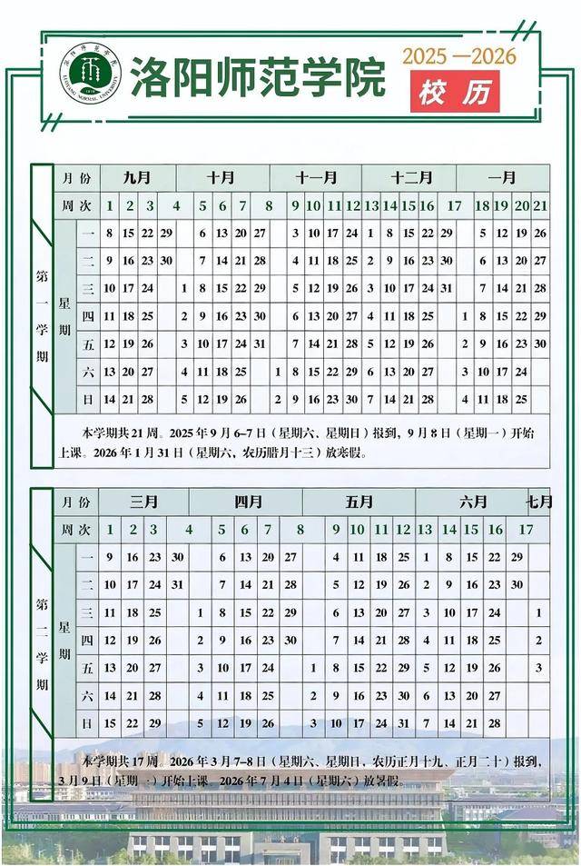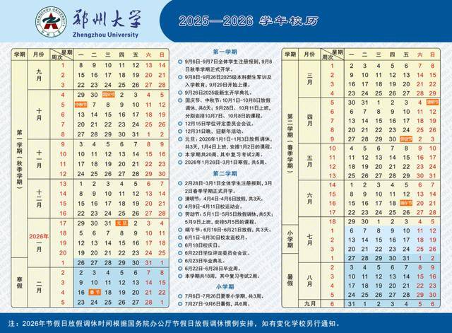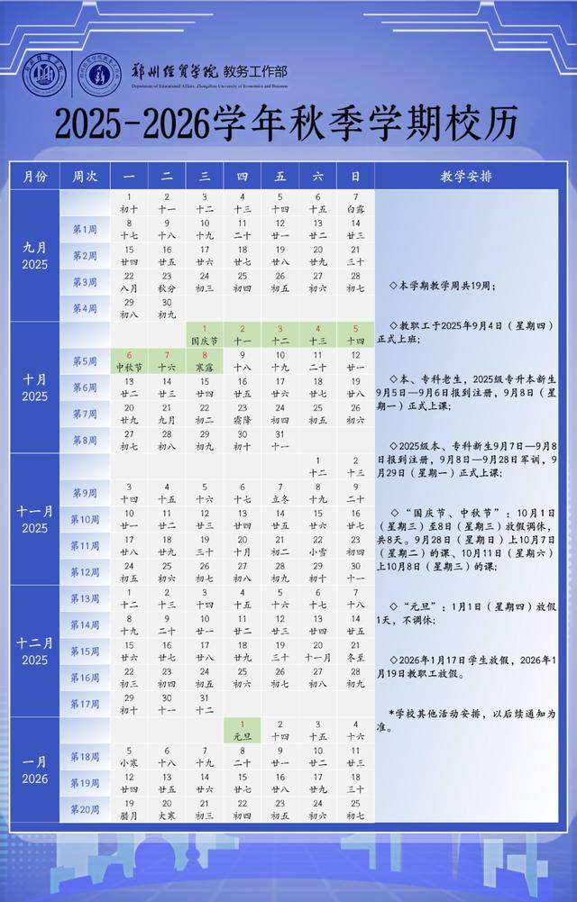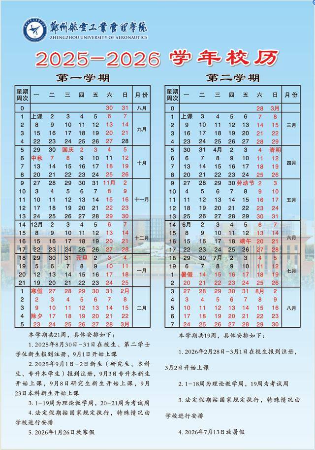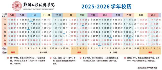 2026年1月19日放寒假(腊月初一,6周)。2026年2月27日教职工报到,学生2月28日-3月1日报到注册。3月2日开始上课。