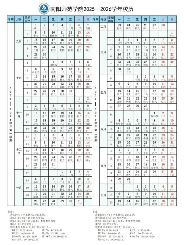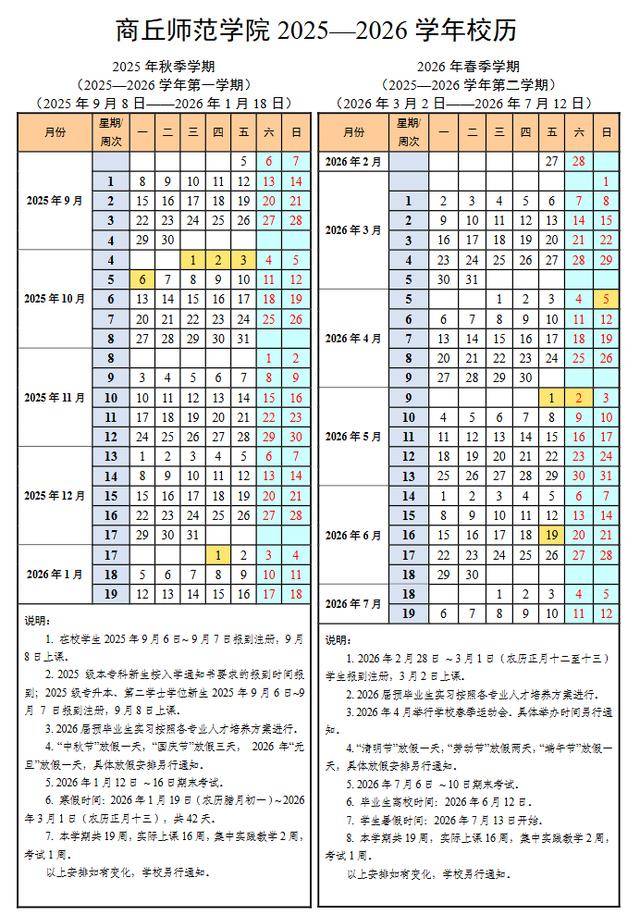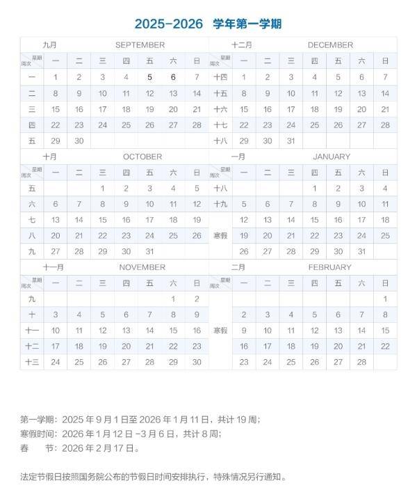 寒假:2026年1月19日~3月1日(农历腊月初一~正月十三),共6周。