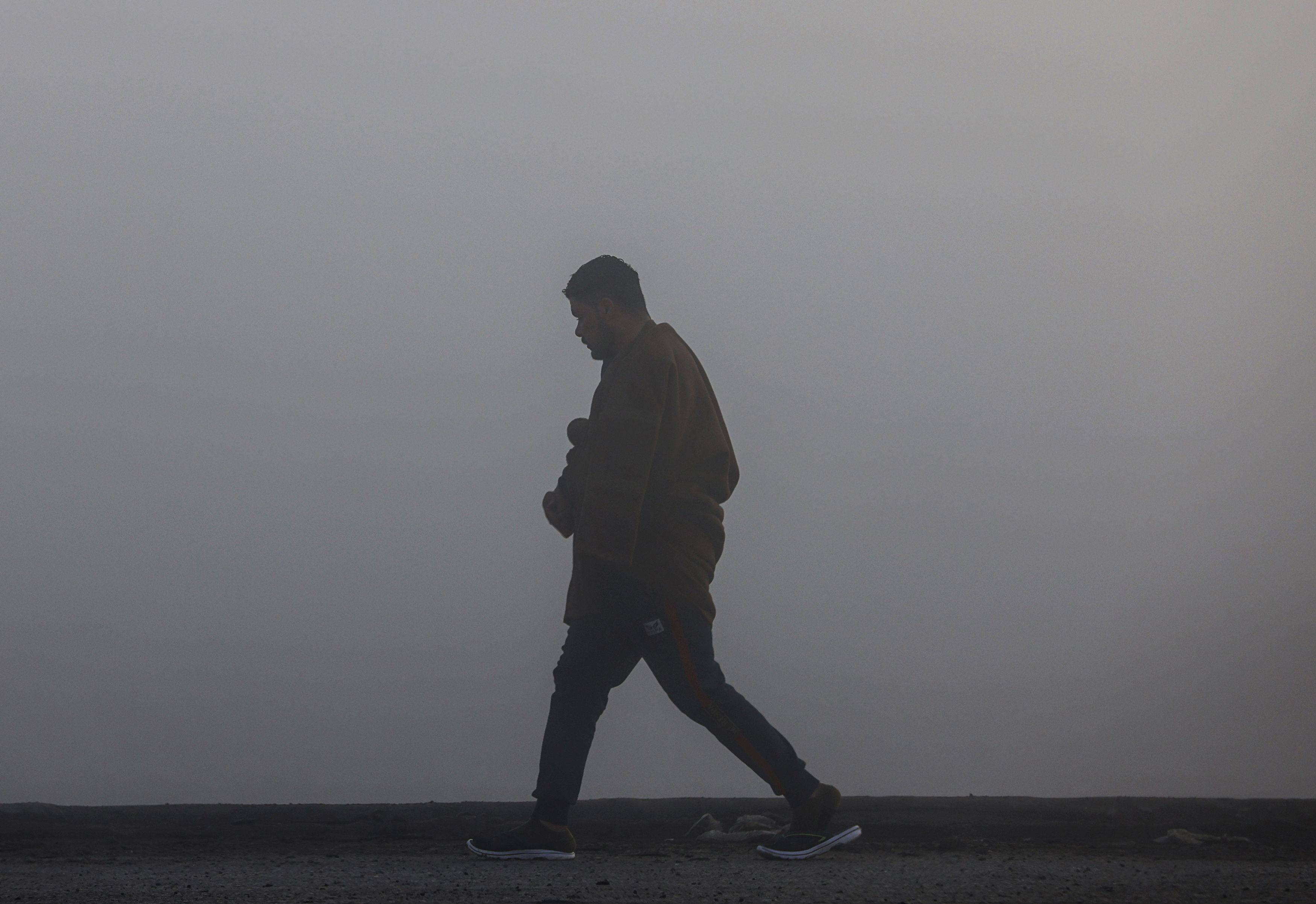 12月21日,在伊拉克迪瓦尼耶的浓雾天气中,一名男子因交通堵塞沿着高速公路边缘行走。 新华社/法新