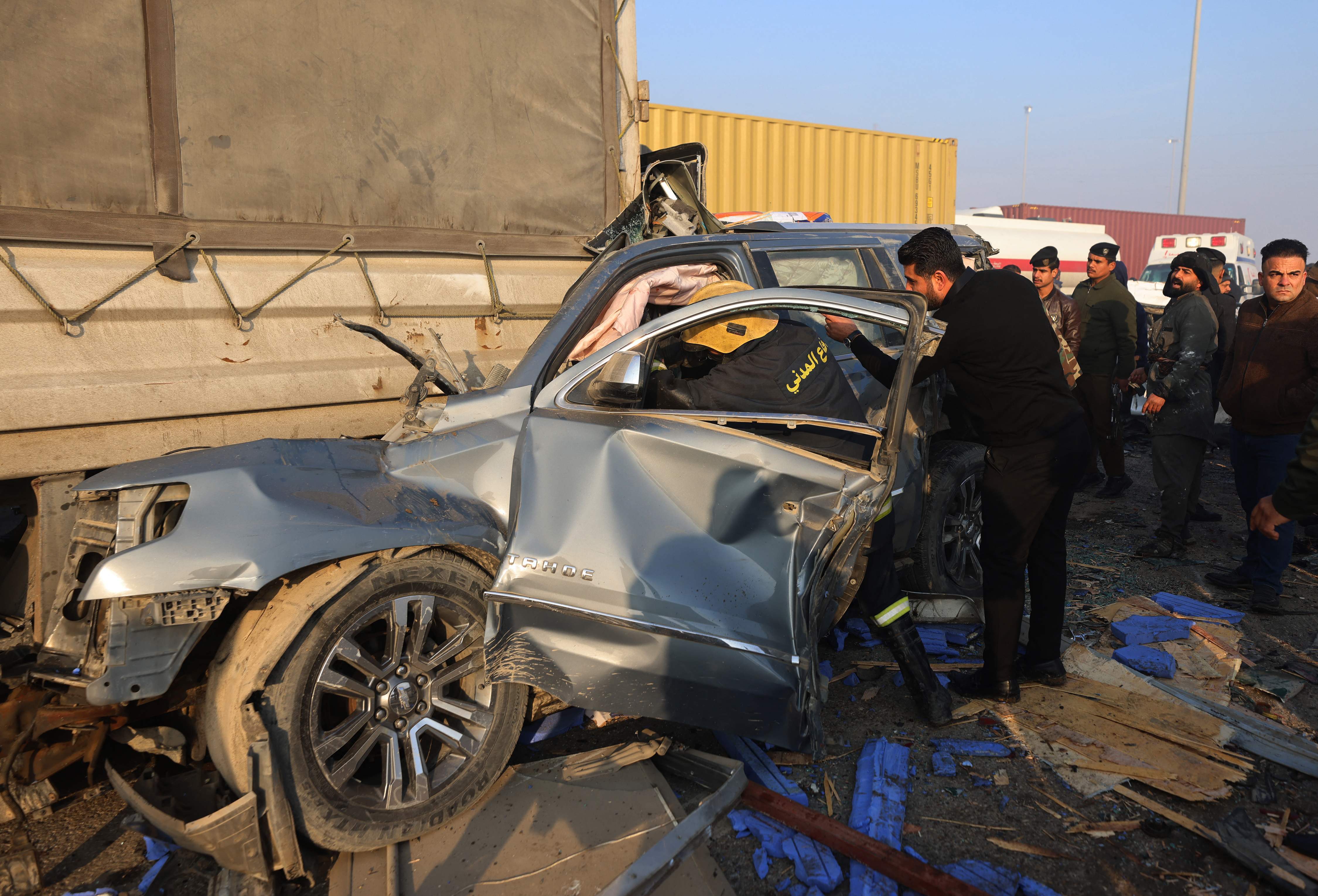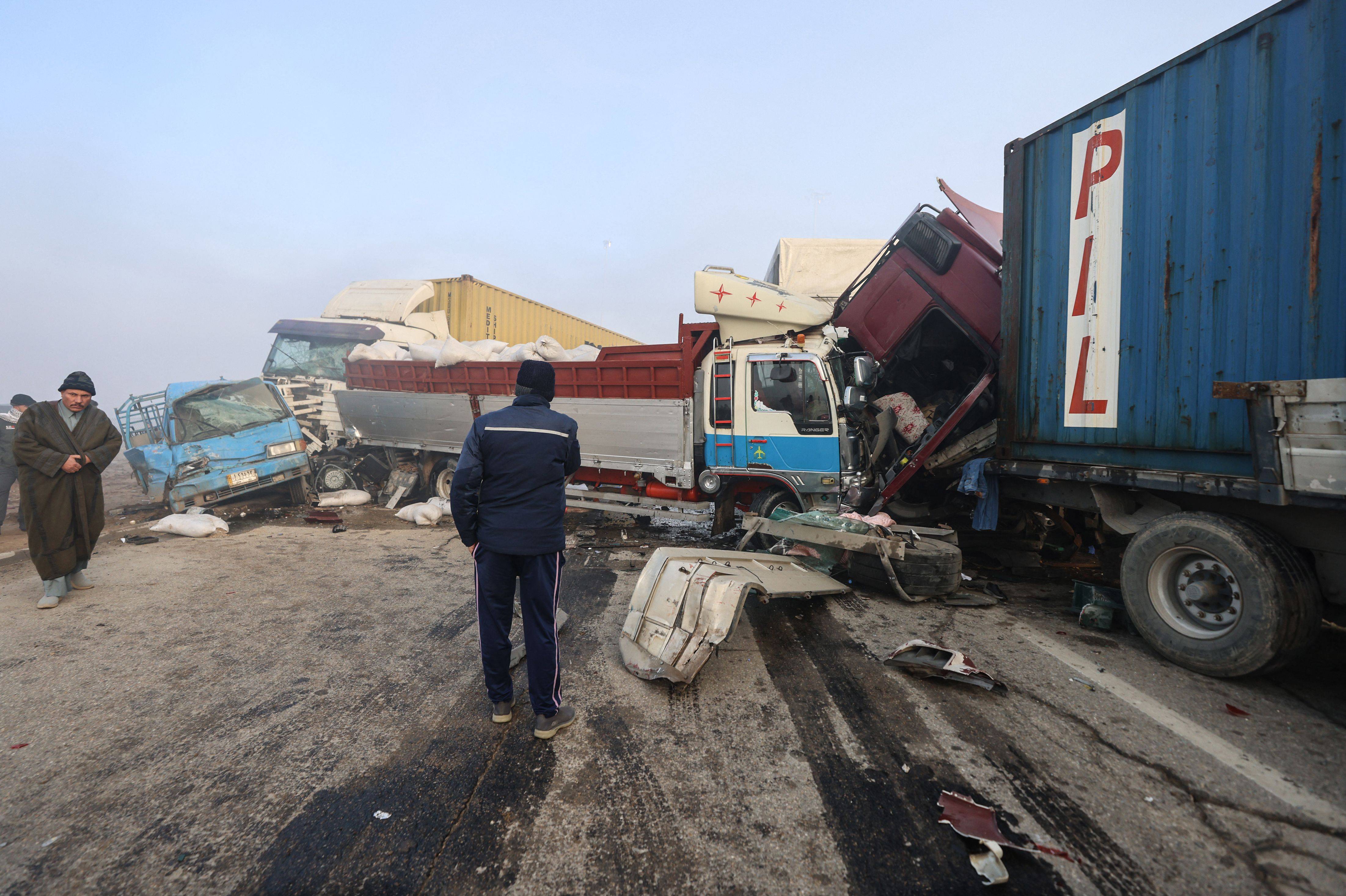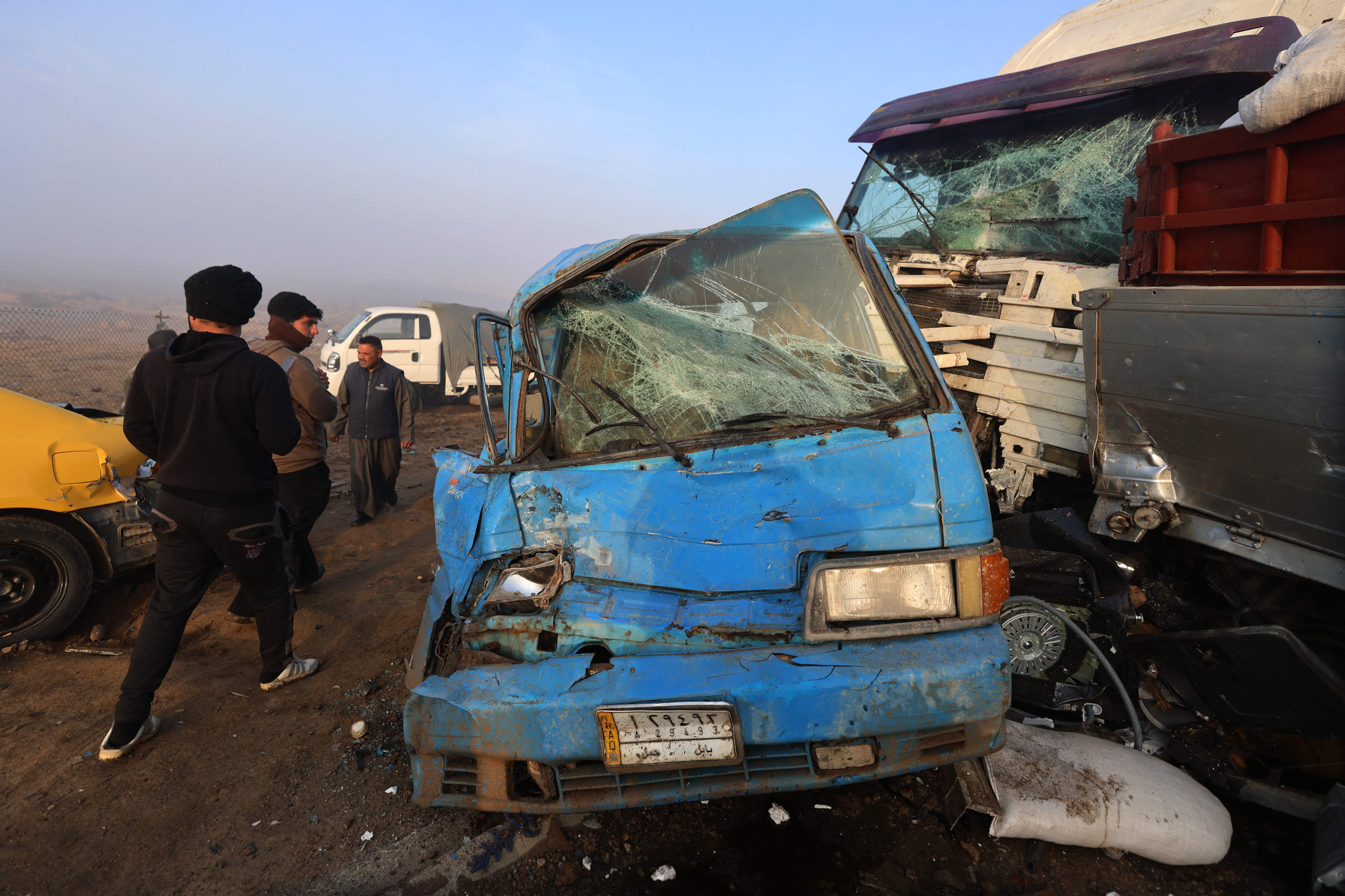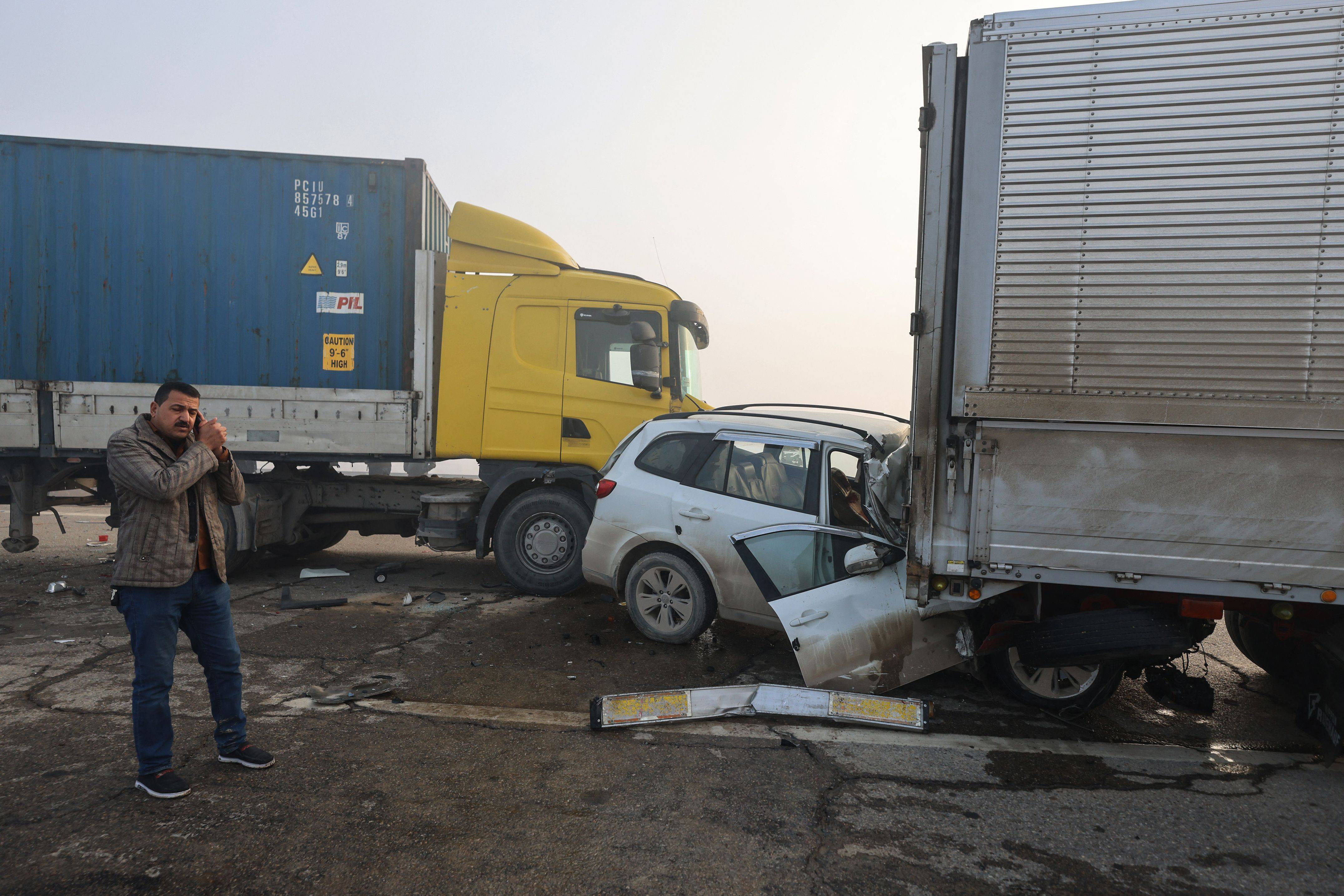 12月21日,在伊拉克迪瓦尼耶附近的高速公路上,车辆因浓雾天气发生交通事故。 新华社/法新