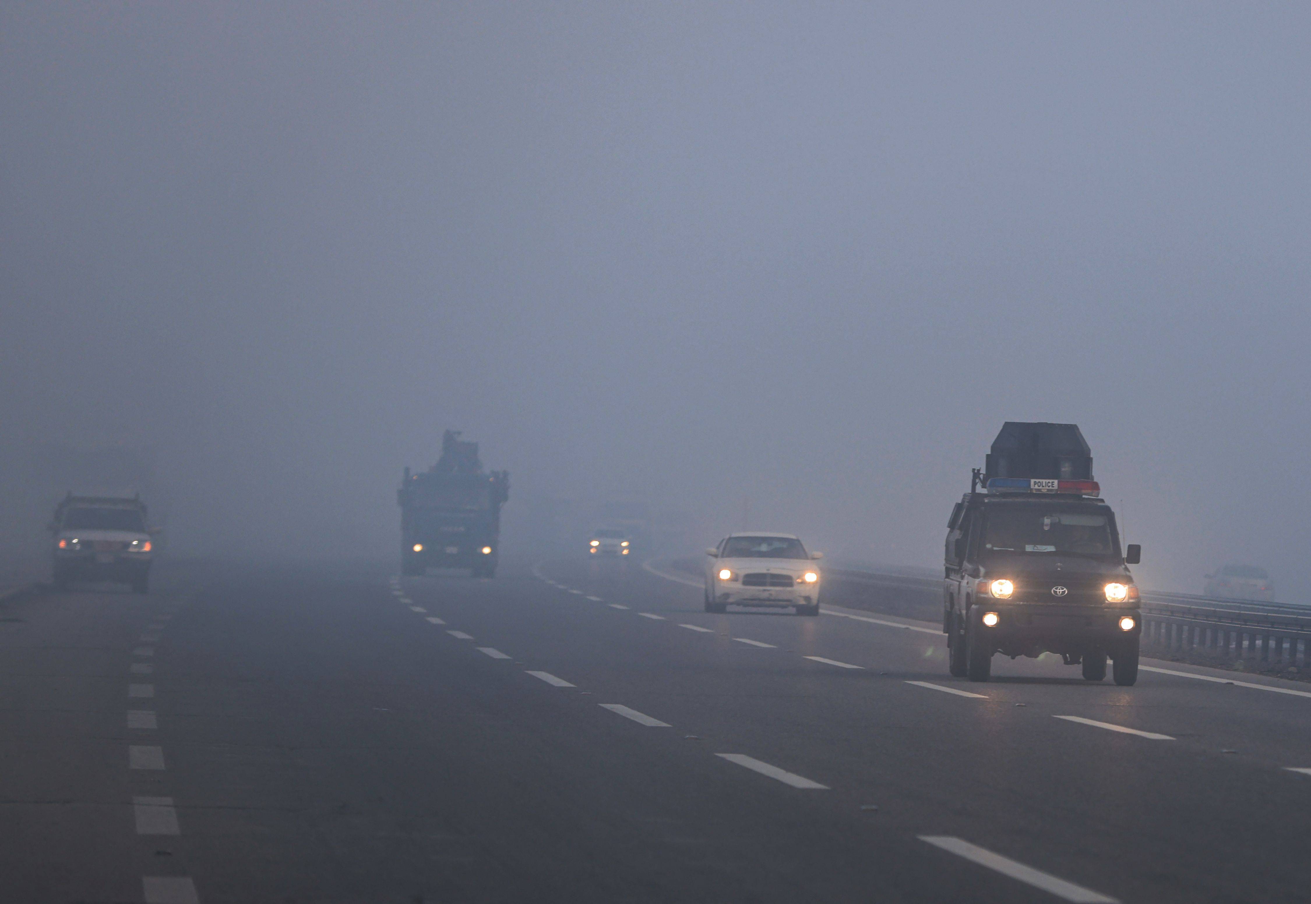 12月21日,在伊拉克迪瓦尼耶附近的高速公路上,车辆在浓雾天气中行驶。 新华社/法新