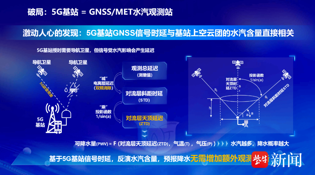 “我们通过实验测试发现,通过5G基站自带的双频北斗高精度授时系统也可以进行大气水汽含量的估算,GNSS信号时延的长短与基站上空云团的水汽含量的高低直接相关,当云团水汽含量变多时,时延就会变大,因此,基于5G基站信号时延反演水汽含量,就可以得出预报的关键数据。”中国移动浙江公司网络部技术专家王科钻介绍。