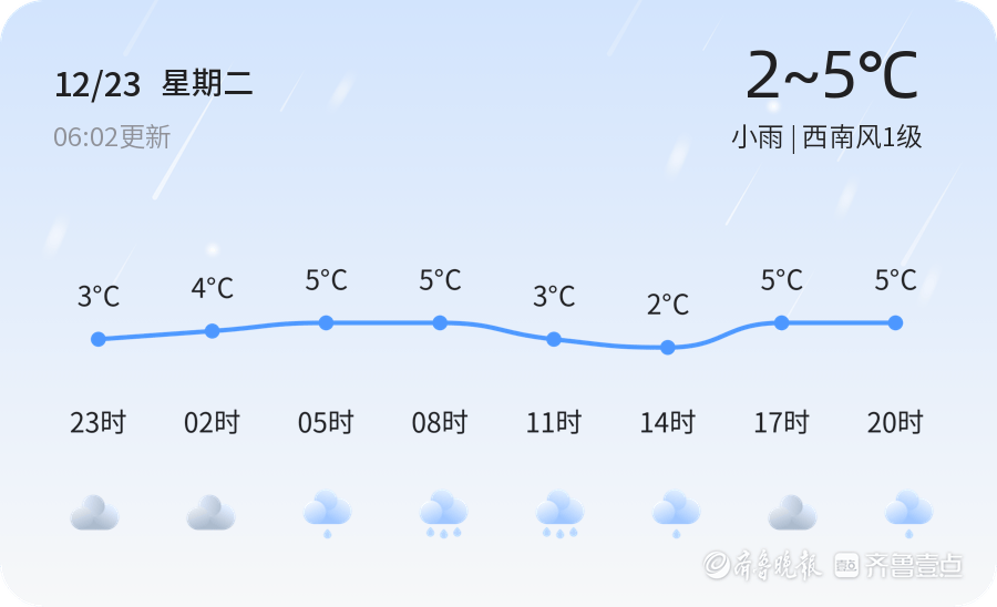 今天是12月23日,农历十一月初四,星期二。烟台迎来小雨天气,气温在2℃到5℃之间,西南风1级,空气湿度高达95%。PM2.5值为18,属于优级,空气质量良好。降雨可能导致道路湿滑,建议市民出行注意安全,特别是早晨和傍晚时段,驾驶时减速慢行,保持车距。
