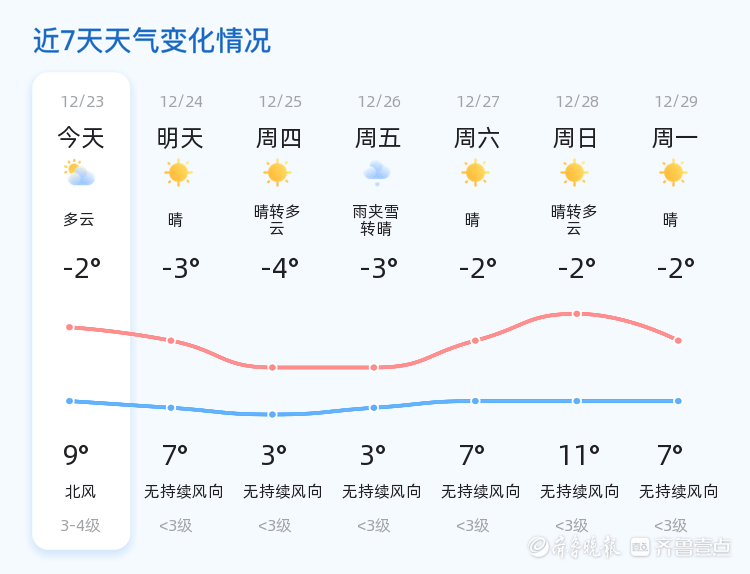 明日12月24日,星期三,天气转晴,气温在-3℃至7℃之间,风力较小,天气较为晴朗。相比今日,气温略有下降,但阳光充足,市民可享受更加舒适的出行体验。