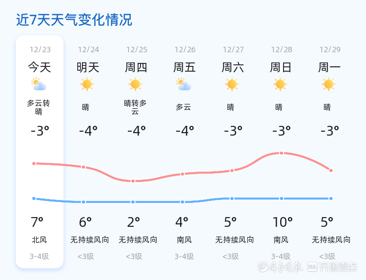 未来三天,聊城市的天气趋势为晴转多云,气温先降后升。12月25日,最低气温-4°C,最高气温2°C;12月26日,天气-4°C,最高气温4°C;12月27日,天气晴朗,最低气温-3°C,最高气温5°C。市民需关注天气变化,及时增减衣物,特别是早晨和傍晚时段,气温较低,建议做好保暖措施。