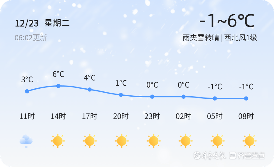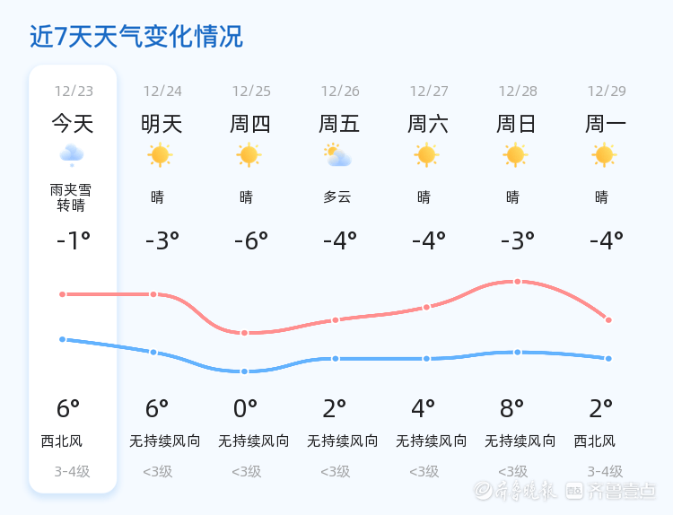 今天是12月23日,星期二,农历十一月初四。东营市今日天气为雨夹雪转晴,气温介于-1°C至6°C之间,西北风1级,空气湿度92%,PM2.5指数为42,空气质量良好。各区天气状况总体平稳,雨夹雪天气已于早晨逐渐转晴,市民出行需注意路面湿滑。nn据气象部门预测,明日12月24日,东营市天气将以晴朗为主,气温范围在-3°C至6°C之间,较今日有所回升,风力减弱为无持续风向,市民可适当减少衣物,但早晚仍需注意保暖。nn未来三天,东营市天气趋势平稳,周四(12月25日)将出现低温天气,最低气温可达-6°C,市民需做好防寒准备。周五至周日天气以晴或多云为主,气温逐步回升,但市民仍需关注天气变化,合理安排出行。nn温馨提示