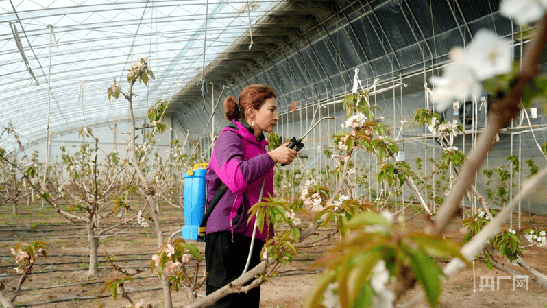 村民其曼古丽·艾米都拉给樱桃花授粉 (央广网发 赵新昌 摄)