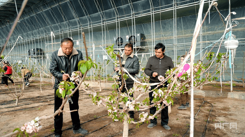 在基地内,一座座现代化智能温室大棚在戈壁滩上整齐排布,成为冬日里一道独特的风景线。步入棚内,温暖如春的气息扑面而来,工作人员手持授粉器,小心翼翼地在樱桃树间开展授粉作业,同时细致检查花穗生长情况、及时清理杂枝,每一个环节都精益求精。