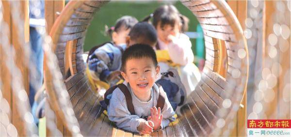 山东青岛,托育班的小朋友在游乐场玩耍。 新华社发