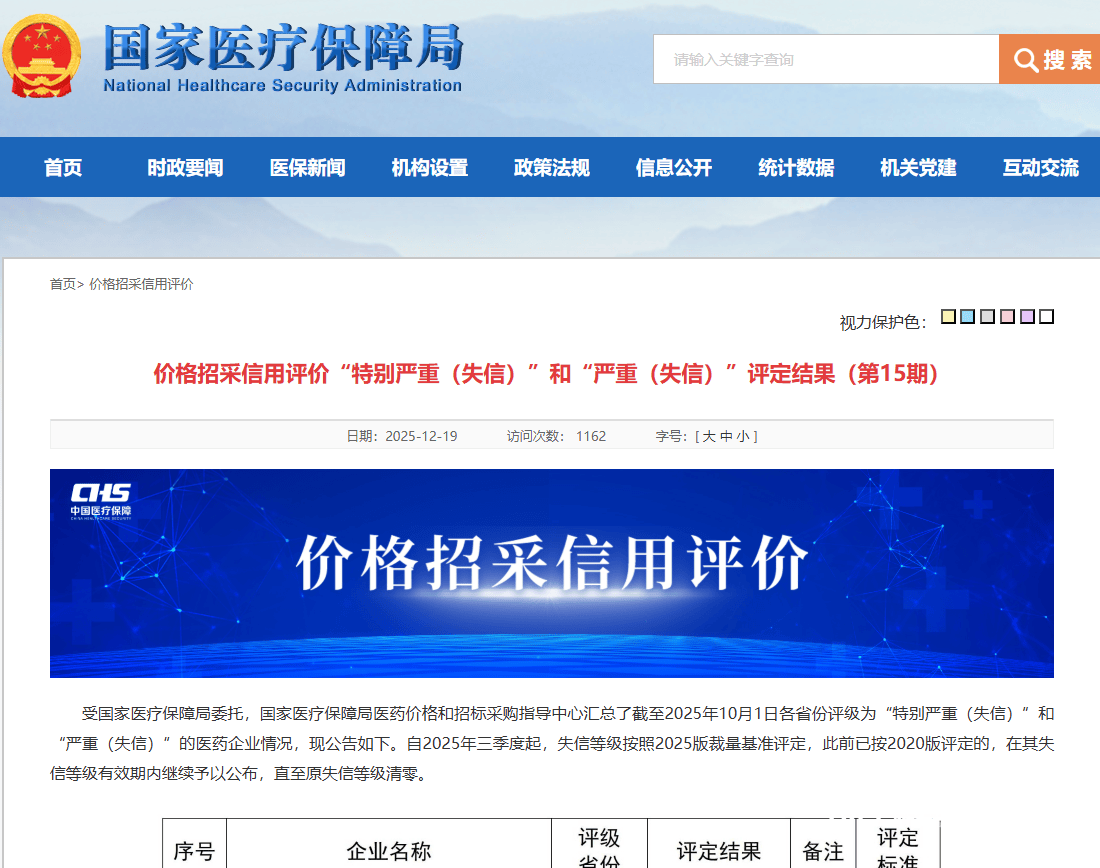近日,国家医疗保障局官网发布价格招采信用评价“特别严重(失信)”和“严重(失信)”评定结果(第15期)。