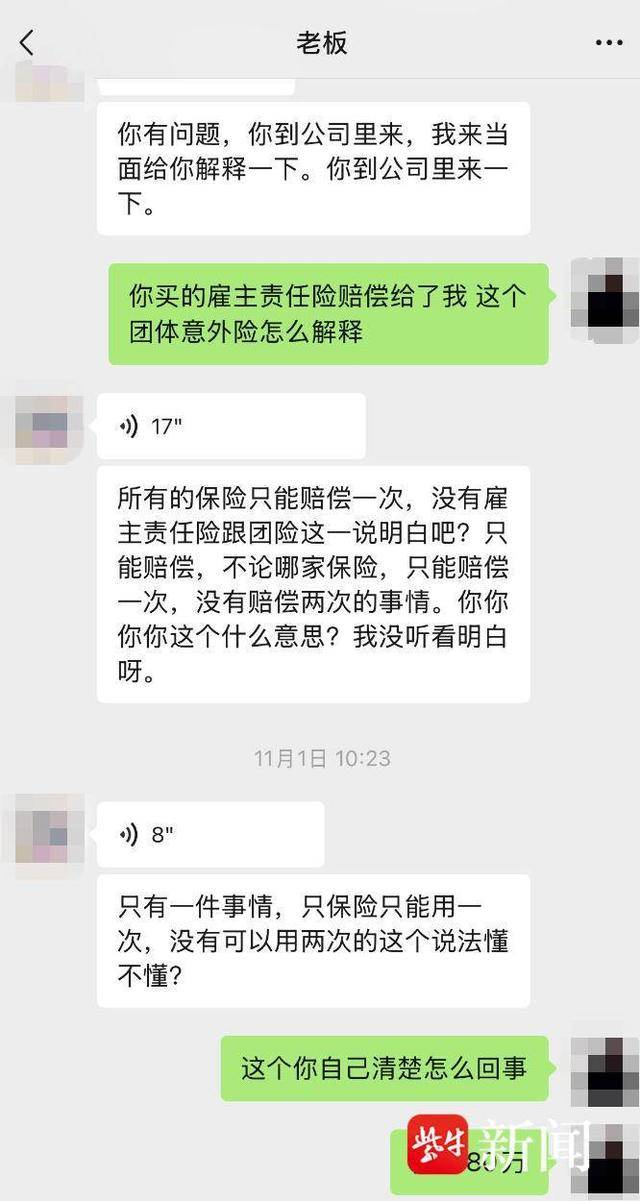 小张告诉记者,得知团体意外险保单后,10月31日,他曾向保险公司业务员询问关于团体意外险的事,业务员表示不清楚,随后便拉黑了小张。11月1日,小张又向老板咨询关于团体意外险的事,老板表示,所有的保险只能赔付一次,并要求小张把之前收到的6万元钱退还给他,让小张自己去找保险公司理赔。