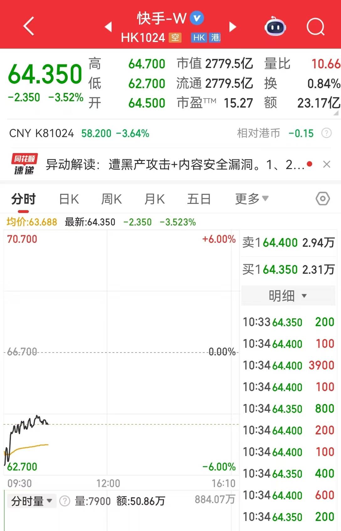 12月23日,截至发稿,快手-W(01024.HK)跌3.52%。早盘一度跌6%。