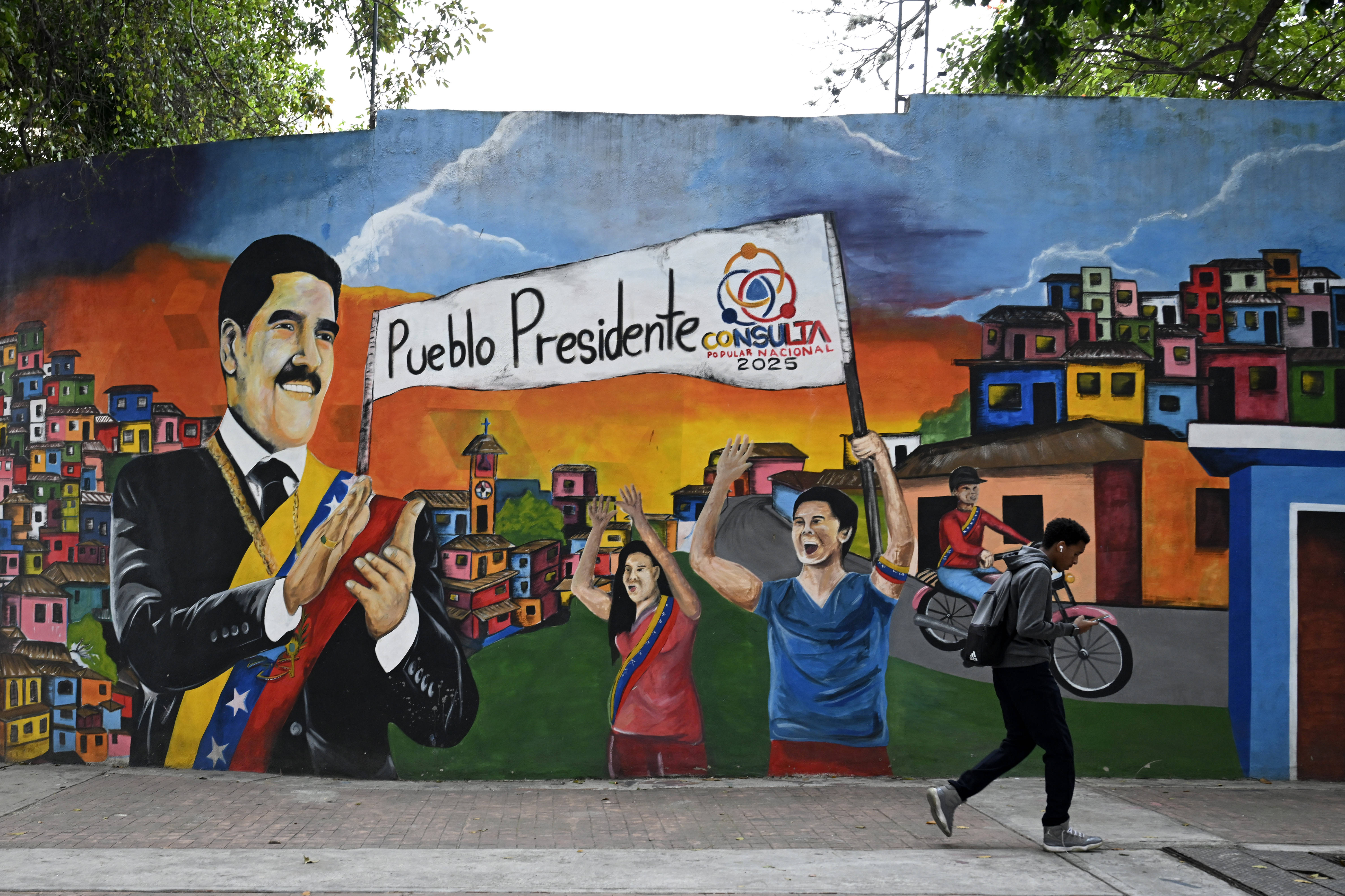 12月2日,在委内瑞拉首都加拉加斯,行人从支持委内瑞拉总统马杜罗的涂鸦墙前走过。新华社记者 李木子 摄