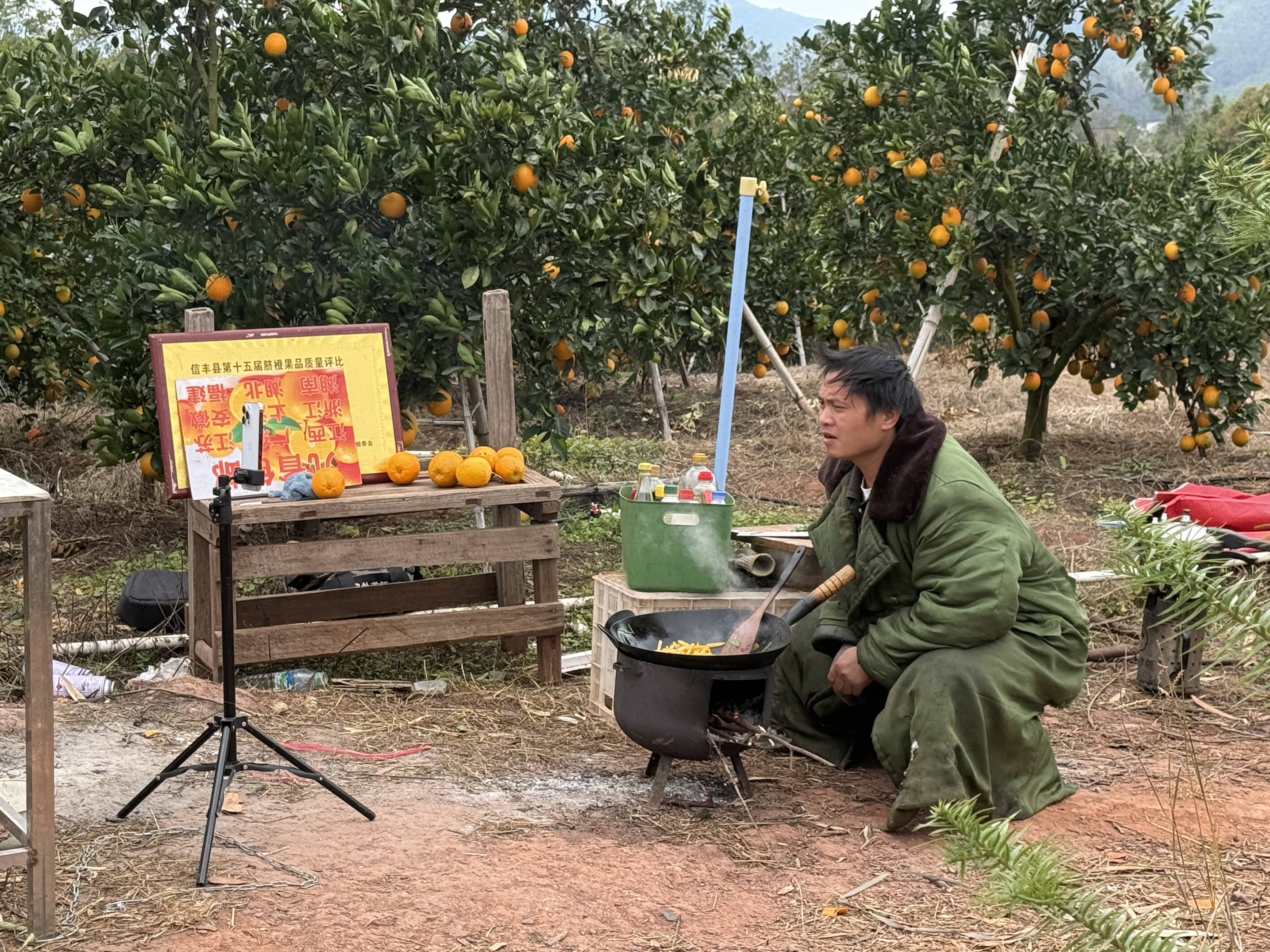 直播内容也粗糙。早上七八点开播,站在结满果子的橙子树边,重复地夸,“正宗赣南脐橙,男人吃了事业有成,女人吃了心想事成,小孩吃了学业有成!”中午架上一口油亮的铁锅,开始直播炒酸辣土豆丝,吃完继续卖脐橙,“家人们点点下方的小黄车链接啊!”天黑了架上大灯,强调自己是一名户外美食主播,依旧直播炒菜做饭。