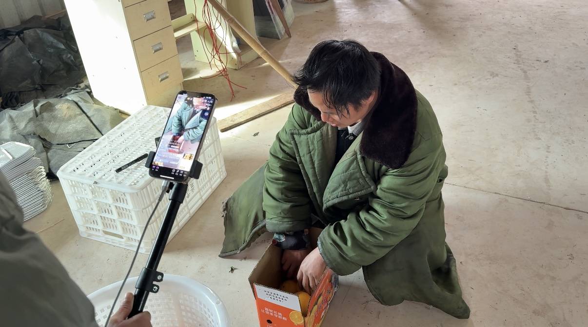 小江西直播打包脐橙。李晓芳 摄