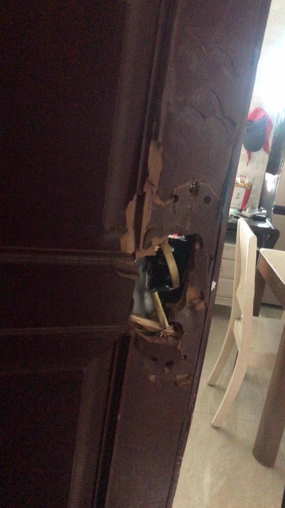 △案发现场,被破坏的门锁。受访者提供