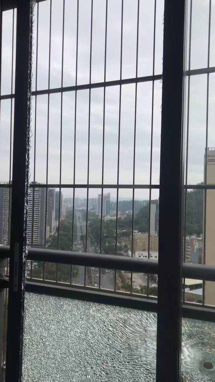 △案发现场的阳台,玻璃被子弹击碎。受访者提供