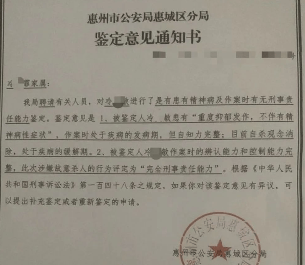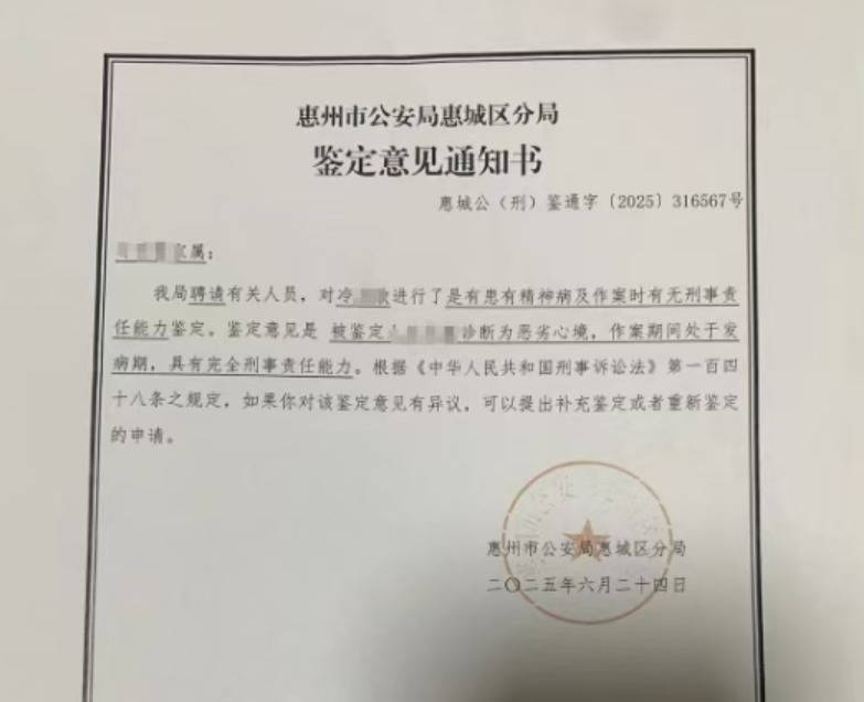 2025年4月、6月,惠州警方分别给冷某敏做了精神鉴定,第一次鉴定显示:冷某敏作案时重度抑郁发作,但辨认能力和控制能力完整,因此故意杀人行为被评定为“完全刑事责任能力”。第二次鉴定显示:冷某敏被诊断为恶劣心境,作案期间处于发病期,具有完全刑事责任能力。