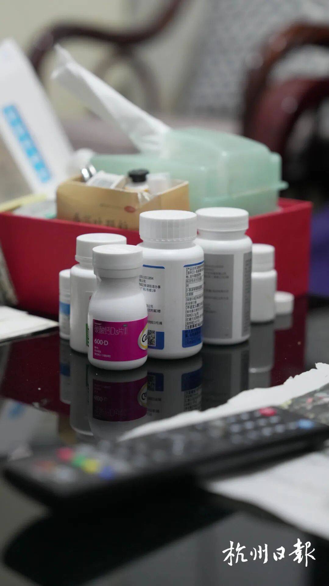 电视机前的茶几上,放着几瓶药,还有各式营养品,是李彩宝的儿女们买来给妈妈的。李彩宝其实不吃,给飞飞吃。