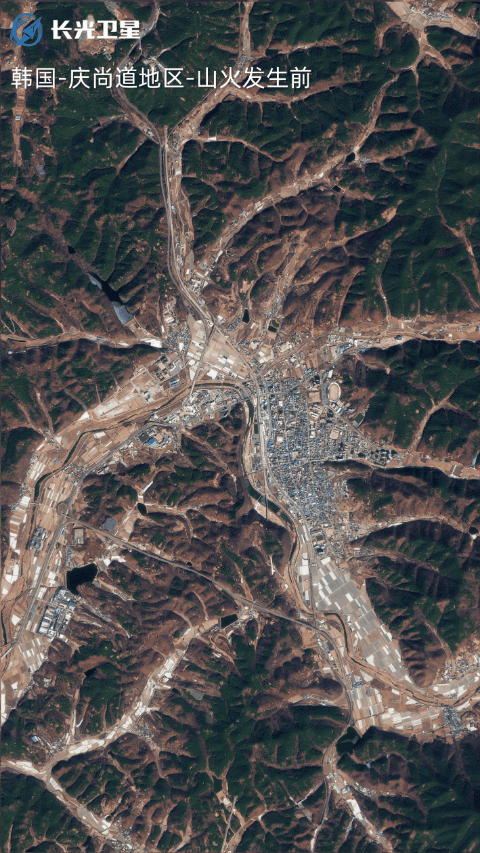 ↑这张动图显示的是韩国庆尚道地区山火发生前后的卫星对比画面。