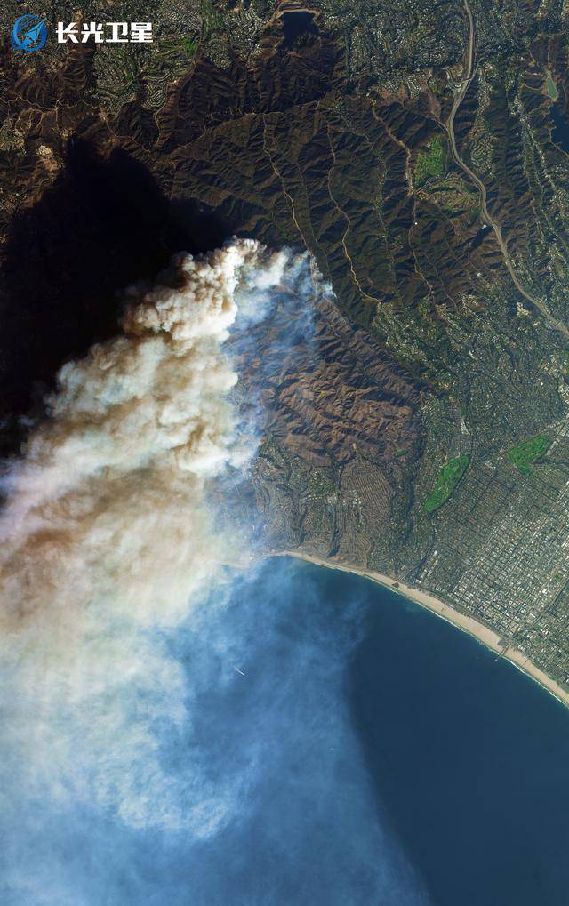 ↑这是2025年1月10日拍摄的美国加利福尼亚州洛杉矶西部地区山火的卫星画面。