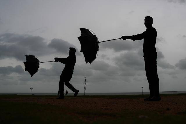 ↑11月27日,在斯里兰卡科伦坡,人们手中的雨伞因极端天气带来的强风被吹坏。新华社发(蒂拉纳·卡卢托塔格摄)