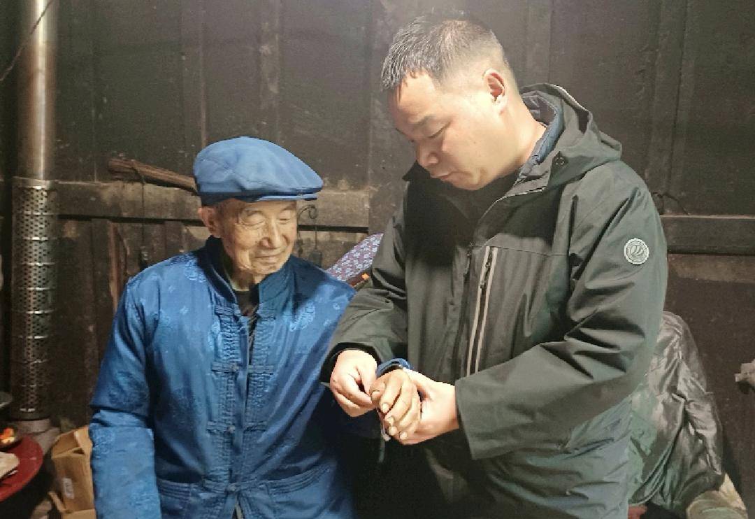 板桥口镇干部给独居老人带上调试好的智能手环