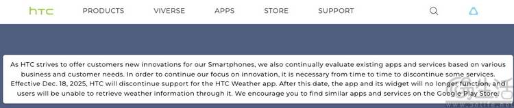 近日有网友发现,HTC在官网发布了一条简短的通告,宣布将停止运营HTC天气应用(HTC Weather app)。具体来说,从2025年12月18日起,HTC天气应用将不再更新天气信息,同时它的小组件也不再运行。