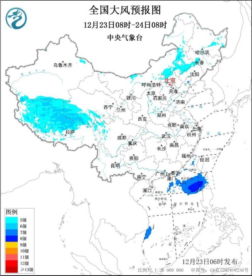 预计,12月23日08时至24日08时,内蒙古中东部、华北北部、黑龙江中东部、吉林西部、辽宁北部及辽东半岛、新疆北疆东部及南疆盆地山区、青海南部、西藏中北部等地有5~6级风,阵风7~8级;巴士海峡、南海东北部将有7~8级、阵风9级的大风,渤海东北部局地海域将有7级、阵风8级的大风。