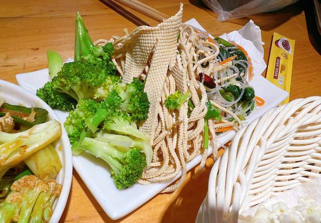还有一道凉拌菜,豆腐皮,切成细丝,泡软了的粉丝晶莹剔透,还有焯过水碧绿的菠菜、橙红的胡萝卜丝。最让人惊喜的是,里面还“藏”了几朵焯熟的西兰花,像翠绿的小树冠。这一盘子,五彩斑斓的,用简单的香油、醋和盐一调,各种食材不同的口感在嘴里交汇,脆的、软的、韧的、滑的,清爽开胃,正好中和炒菜的温热。