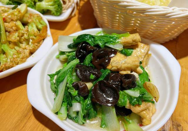 先看这一盘,是小白菜炒豆腐。嫩绿的小白菜,配着雪白软嫩的豆腐块,里面还零星点缀着几朵黑色的木耳。清清白白的一盘,油光不大,看着就清爽。夹一筷子,小白菜还带着脆生的口感,豆腐吸饱了菜汁,又嫩又入味,木耳咯吱咯吱的,给软滑的菜肴添了几分趣味。早上起来,肠胃还没完全苏醒,这第一口清淡爽口的家常炒菜,真是熨帖。