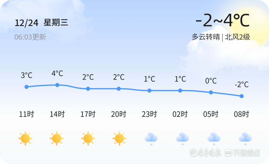 今天是12月24日,星期三,农历十一月初五。烟台市天气多云转晴,温度在-2℃到4℃之间,北风2级,空气湿度65%。当前空气质量良好(PM2.5为25),适合户外活动。市民出行时建议根据实时温度调整衣物,注意保暖,特别是早出晚归的朋友,务必携带防风外套。此外,由于天气转晴,早晚温差较大,提醒市民及时增减衣物,谨防感冒。