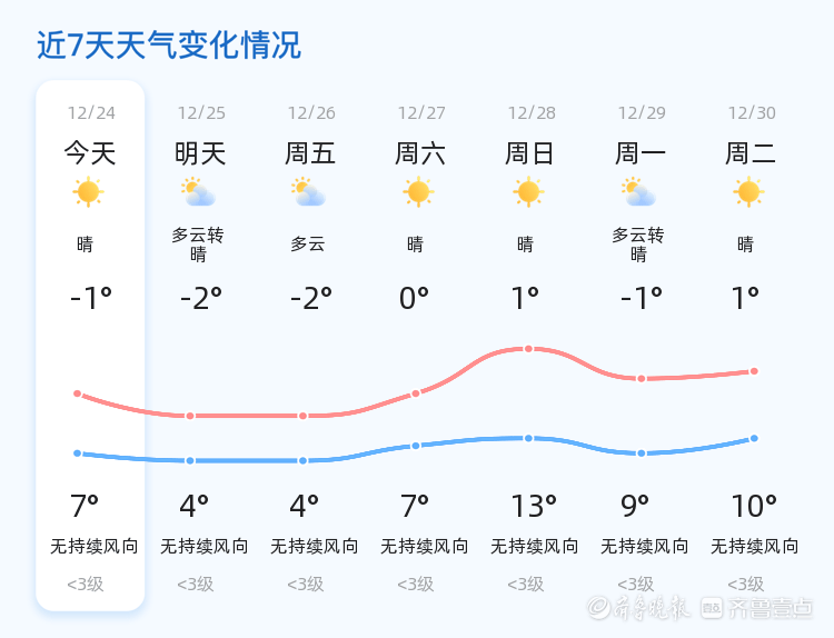 明天12月25日,菏泽市的天气将由多云转晴,与今天相比,气温略有下降。明天的最高气温预计为4℃,最低气温为-2℃,风力仍然较小,以无持续风向为主。市民需关注气温变化,特别是早晨和夜间,做好保暖措施。