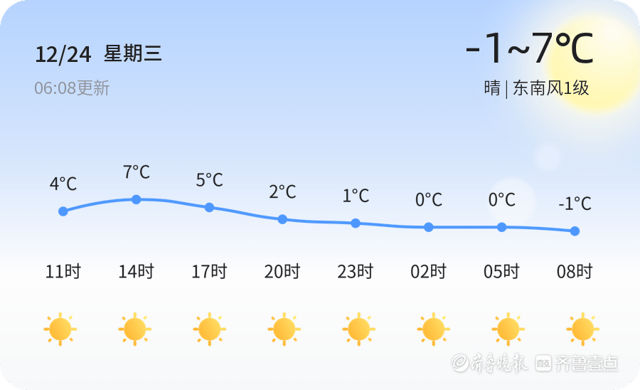 今天是12月24日,星期三,农历十一月初五。菏泽市迎来了一天的晴好天气,气温较为适宜。今天全市各区的天气情况基本一致,均为晴天,东南风1级,空气湿度较高,达到95%。当前温度为-2.1℃,白天最高气温预计将达到7℃,夜间最低气温为-1℃。市民在享受晴好天气的同时,需注意早晚温差较大,适时增减衣物。PM2.5指数为105,空气质量良,适合户外活动。