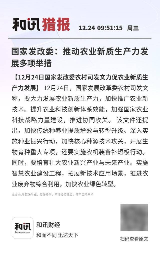 【12月24日国家发改委农村司发文力促农业新质生产力发展】12月24日,国家发展改革委农村司发文称,要大力发展农业新质生产力,加快推广农业新技术。提升农业科技创新体系效能,加强国家农业科技战略力量建设,推进协同攻关。 该文件还提出,加快传统种养业提质增效与转型升级。深入实施种业振兴行动,加快核心种源技术攻关,开展生物育种重大专项,还要实施农机装备补短板行动。 同时,要培育壮大农业新兴产业与未来产业。实施智慧农业建设工程,拓展新技术应用场景,推进农业废弃物综合利用,加快农业绿色转型。