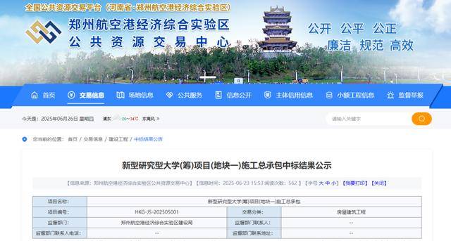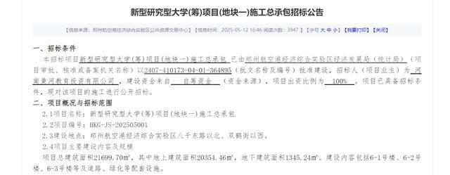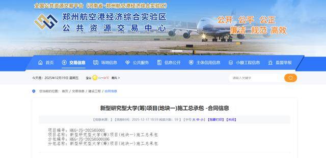 12月17日,郑州航空港经济综合实验区公共资源交易中心发布《新型研究型大学(筹)项目(地块一)施工总承包-合同信息》。其中明确,发包人为河南黄河教育投资有限公司,承包人为中建三局集团有限公司。项目计划开工日期为2025年7月5日,计划竣工日期为2026年7月19日,工期总日历天数为380天。