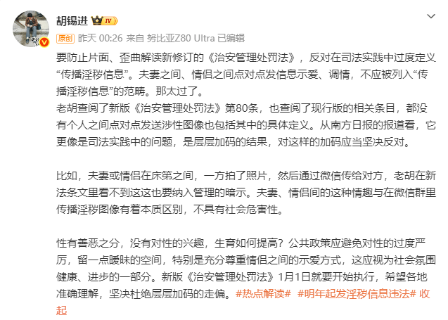 12月23日,知名媒体人胡锡进在社交平台发声认为夫妻间、情侣间点对点示爱、调情,不应被列入“传播淫秽信息”的范畴。要防止片面、歪曲解读新修订的《治安管理处罚法》,反对在司法实践中过度定义“传播淫秽信息”。