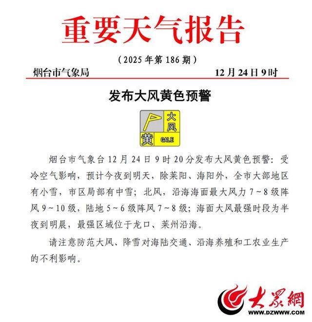 烟台市气象台12月24日9时20分发布大风黄色预警:受冷空气影响,预计今夜到明天,除莱阳、海阳外,全市大部地区有小雪,市区局部有中雪;北风,沿海海面最大风力7~8级阵风9~10级,陆地5~6级阵风7~8级;海面大风最强时段为半夜到明晨,最强区域位于龙口、莱州沿海。