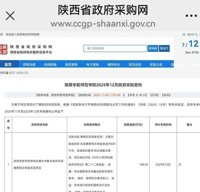 值得注意的是,学校今年11月初发布的一项采购信息显示,雁塔校区拟完成食堂改造约600平方米,预算金额为180万元。