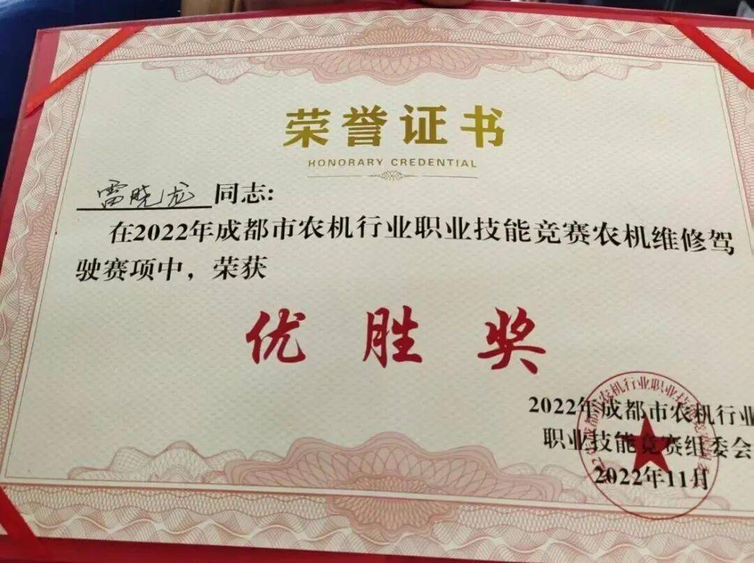 2022年,雷晓龙在成都市农机行业职业技能竞赛农机维修驾驶赛项中荣获优胜奖;2024年在成都市农机行业职业技能竞赛农机维修驾驶赛项中获得第六名,还取得了中级职业经理人职称。今年,他又被续聘为简阳市农业机械指导员。