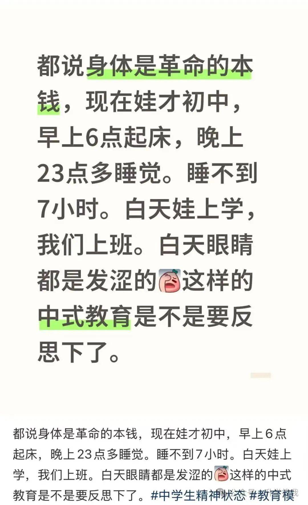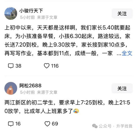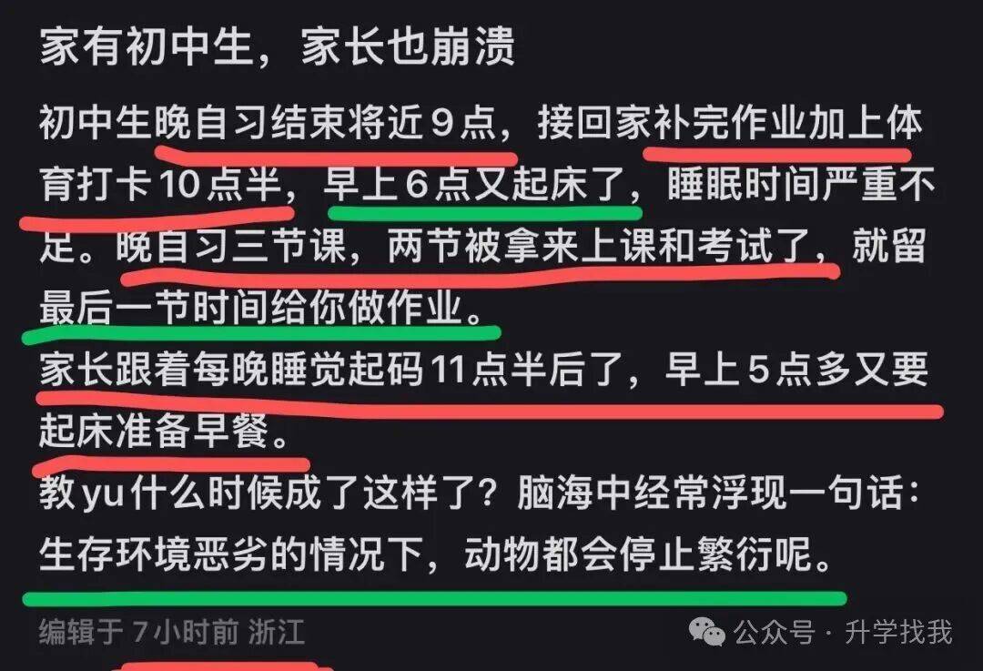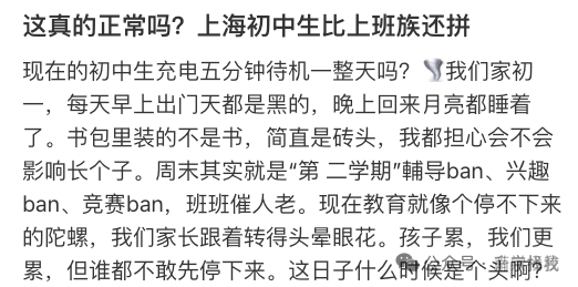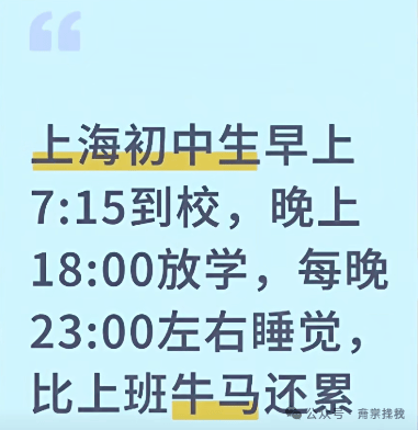 上海有初中生家长抱怨,孩子早上 7:15 就得到校,晚上 18:00 才放学,每晚 23 点左右才能入睡,学习强度远超上班族,身心俱疲。