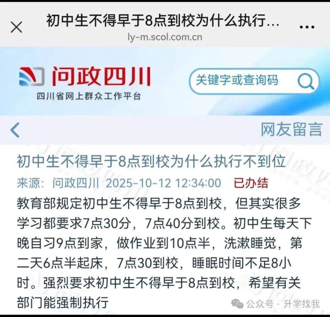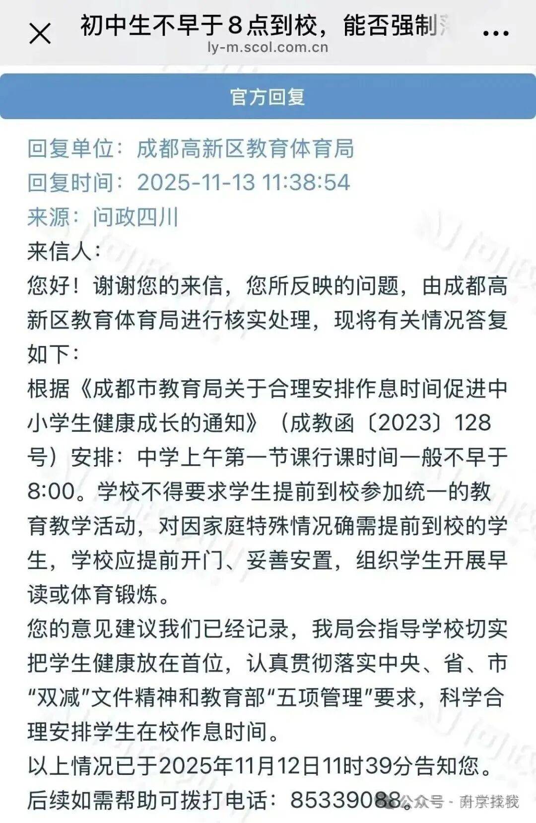 前段时间,一位四川网友在当地问政平台询问,初中生“不早于 8 点到校”的规定为何难以落实。