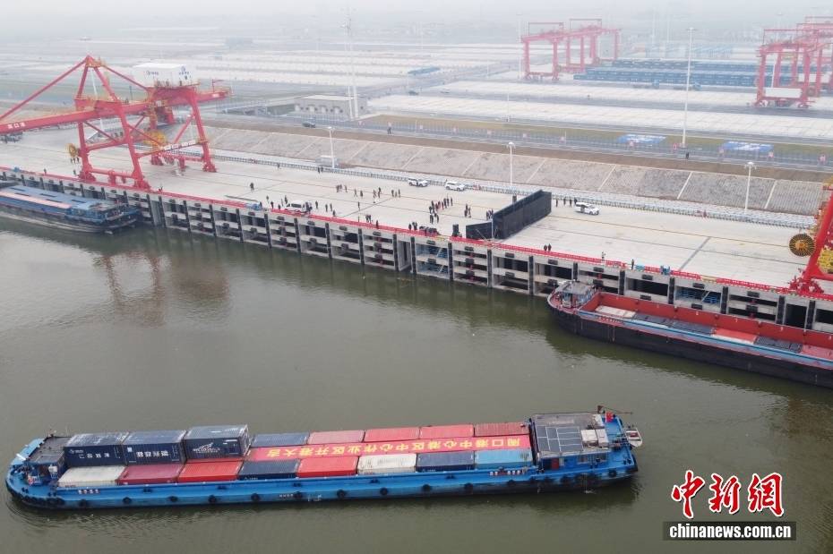 12月24日,位于河南省商水县的周口港中心作业区正式开港运营。该中心作业区是目前河南省泊位数量最多的内河集装箱专用码头。图为周口港中心作业区。(无人机照片)中新社发 刘俊涛 摄