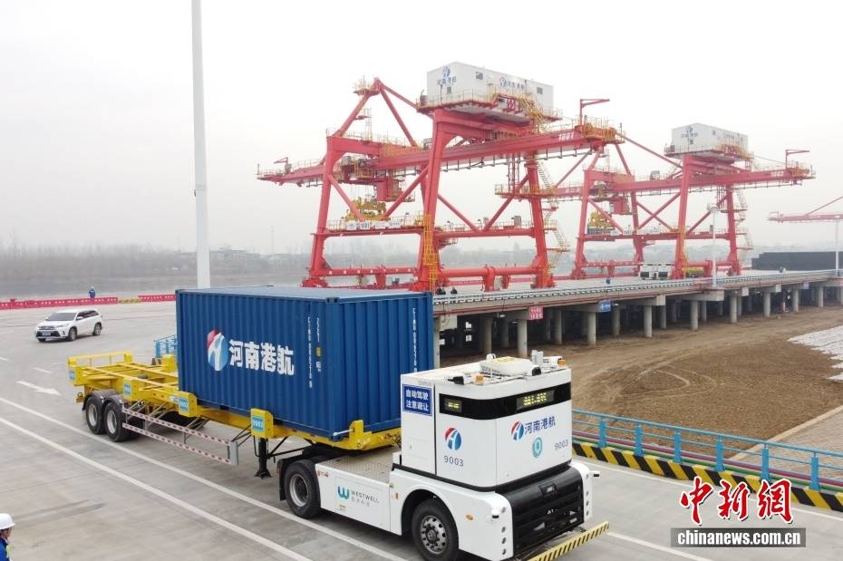 12月24日,位于河南省商水县的周口港中心作业区正式开港运营。该中心作业区是目前河南省泊位数量最多的内河集装箱专用码头。图为无人集卡行驶在周口港中心作业区。(无人机照片)中新社发 刘俊涛 摄