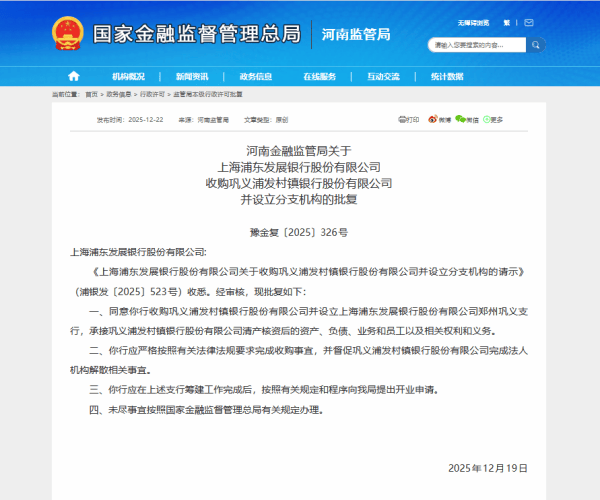 12月22日,国家金融监督管理总局河南监管局发布批复,同意浦发银行收购巩义浦发村镇银行并设立郑州巩义支行。这家成立于2009年、注册资本1.5亿元的村镇银行将告别独立法人身份,全部资产、负债、业务及员工被纳入浦发银行统一管理框架。