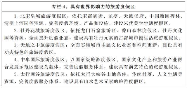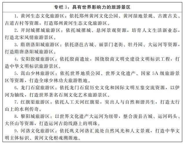 一、建设具有世界影响力的旅游景区和度假区。依托世界遗产、国家5A级旅游景区和特品级旅游资源,高标准建设一批具有黄河魂、古都韵、中国情的旅游景区和度假区。