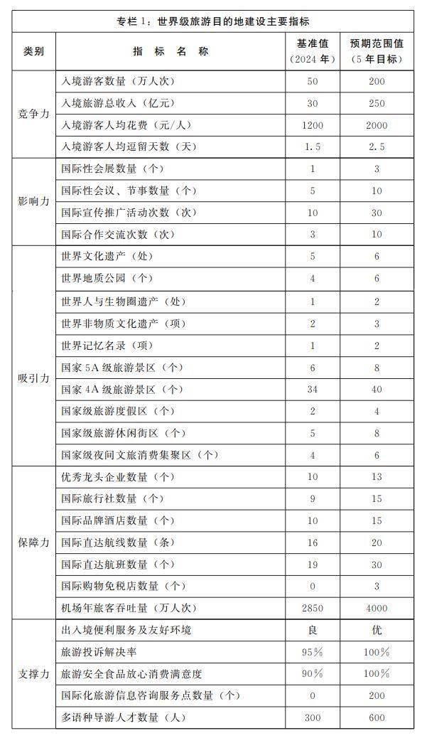 在核心指标上,《规划》从竞争力、影响力、吸引力、保障力、支撑力等五大维度设定30项具体指标,其中5年目标涵盖入境游客人均花费提升至2000元、国际直达航线数量增至20条、多语种导游人才达600人、国际化旅游信息咨询服务点实现从0到200个的跨越等关键突破,为《规划》落地提供了刚性约束与明确指引。这种目标量化、路径清晰的设定,让世界级旅游目的地建设从“愿景”变为“实景”有了坚实支撑。