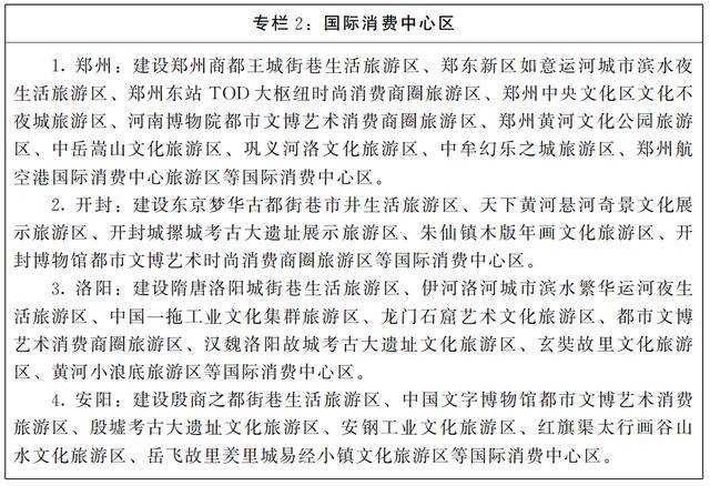三、品牌支撑。郑州定位“天地之中、功夫之都”,开封定位“悬河古都、东京梦华”,洛阳定位“千年古都、牡丹花城”,安阳定位“中国字都、殷商胜地”,着力建设一批具有代表性的国际消费中心区。