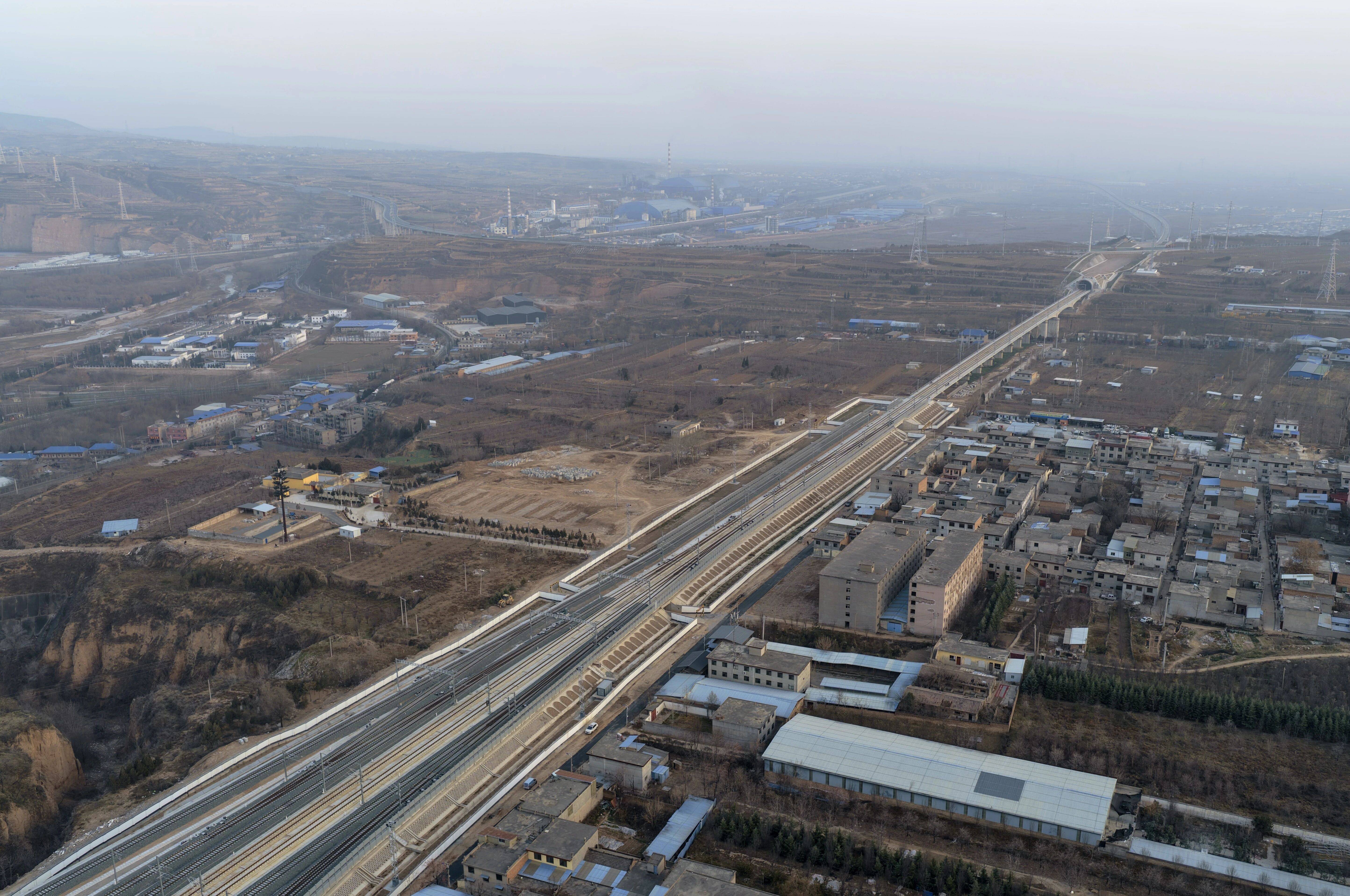 12月24日拍摄的西延高铁铜川段(无人机照片)。 新华社记者 邢广利 摄